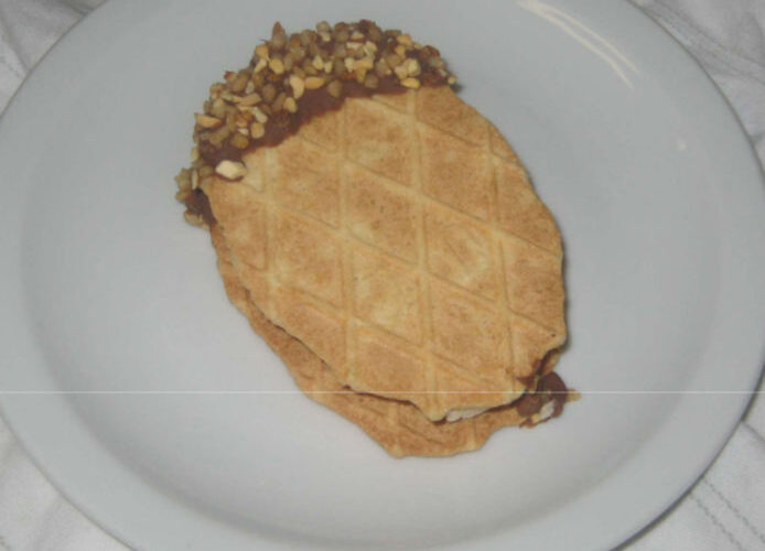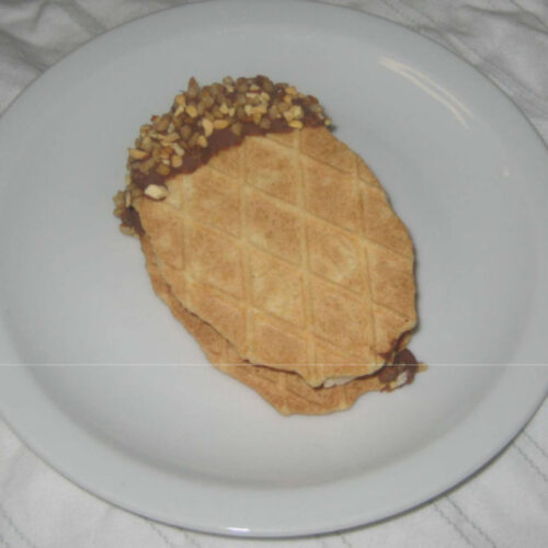 - Doe de nootjes in een schaaltje, dompel de ijssandwich met 1kant in de chocolade en bestrooi de chocolade met wat nootjes,leg op een schaal bedekt met boterpapier en bewaar in dediepvries